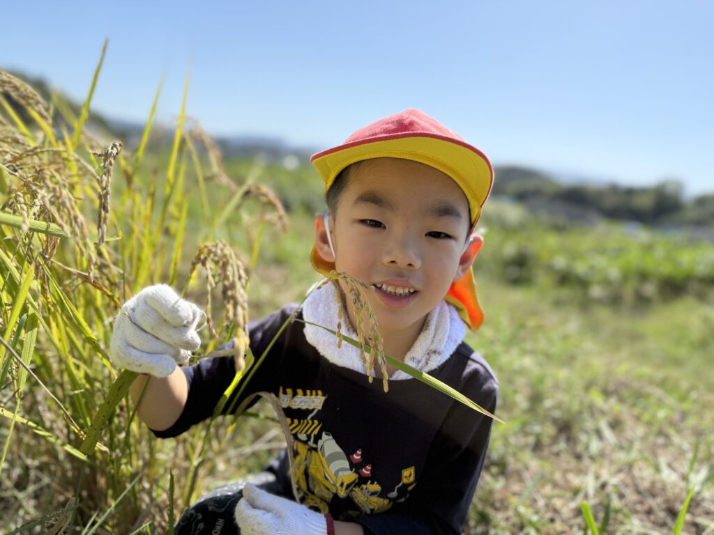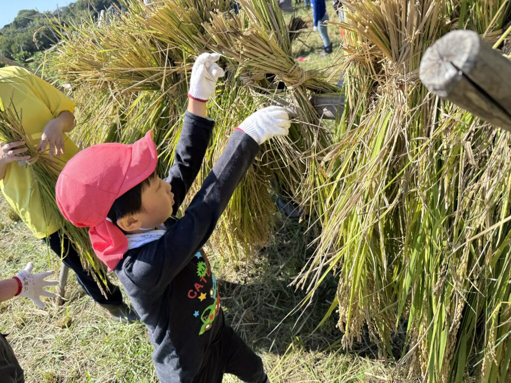 6月の田植えから大きく成長した稲穂を見て大喜びの子どもたち、カマを使って上手に刈ることができましたよ✨はさがけも上手でした🌟