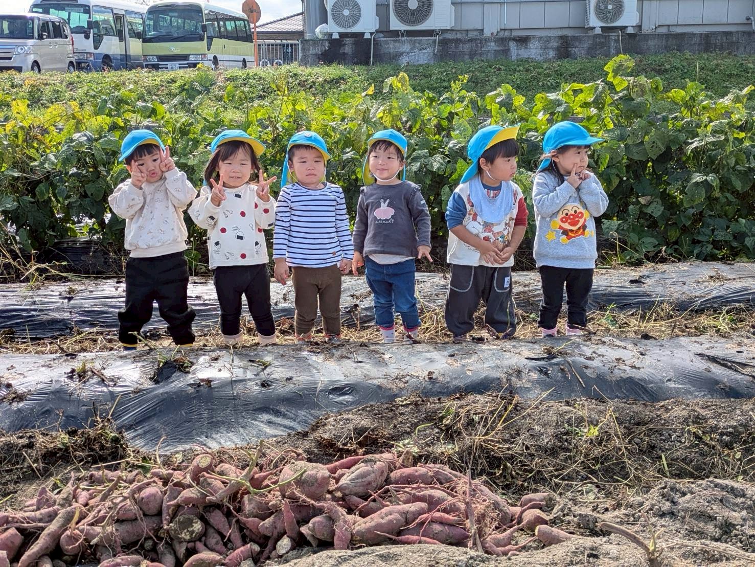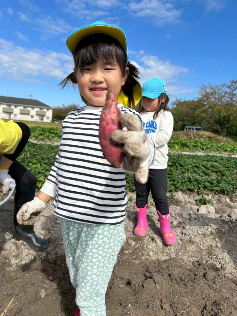 保育者と一緒に力いっぱい引っ張っておいもが抜けると、大喜びでした!