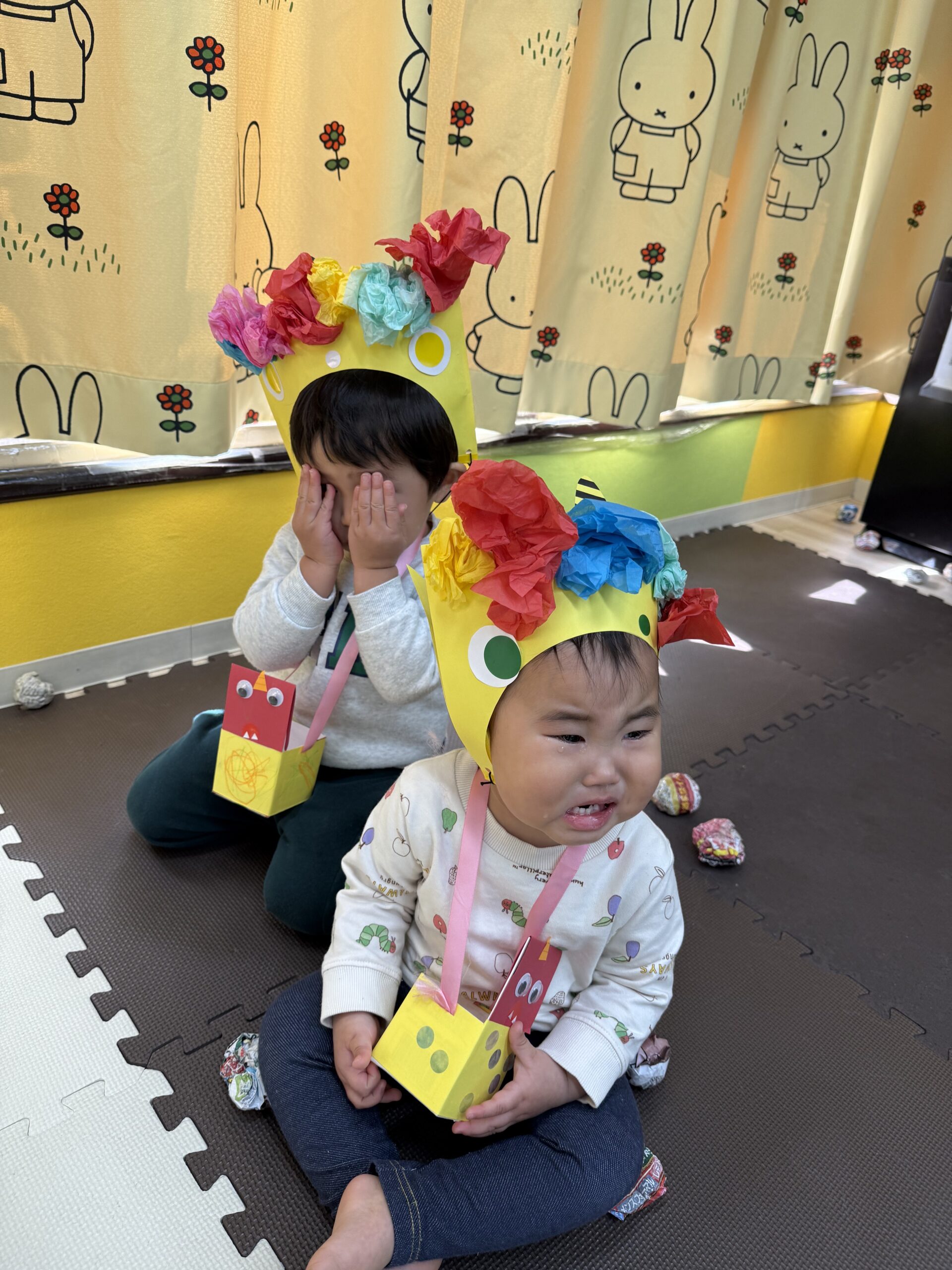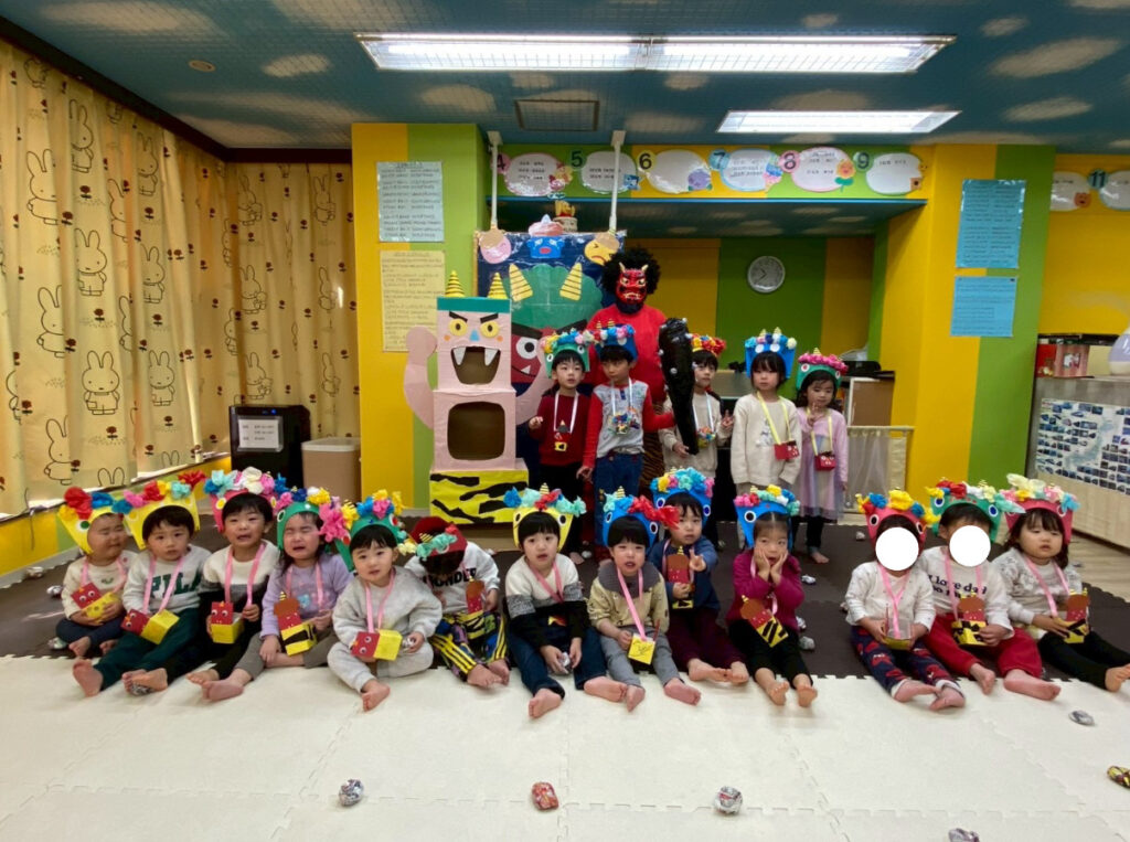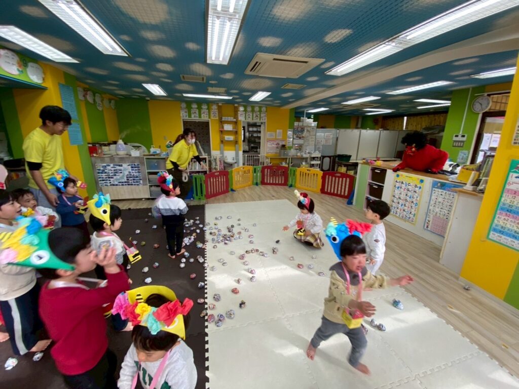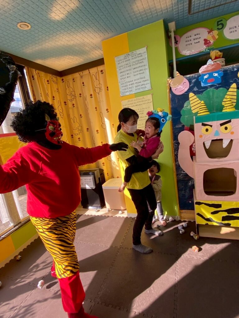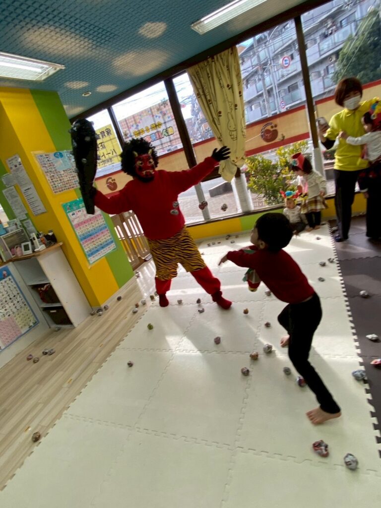 今日は節分会をしました!鬼の登場に驚き涙する子どもたちでしたが、一生懸命豆を投げる子もおり、最後には鬼は優しくなってみんなでお友達になりましたよ🎶
